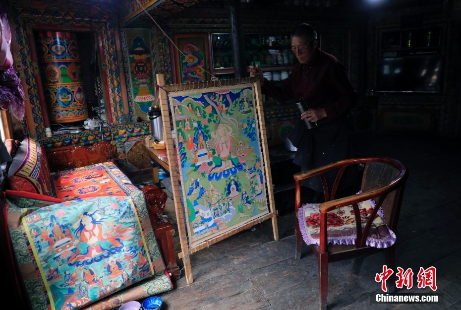 8月17日,日斯?jié)M巴碉房的主人洛吾王爾甲在客廳里準(zhǔn)備繪制唐卡。日斯?jié)M巴碉房坐落于四川省阿壩藏族羌族自治州壤塘縣宗科鄉(xiāng)加斯?jié)M村石波寨,修建于元末明初,距今已有近700年的歷史。碉房共分九層,高25.6米,外型呈階梯狀,是一座保存完好的藏式傳統(tǒng)民居。2006年,日斯?jié)M巴碉房被列為全國重點(diǎn)文物保護(hù)單位。 中新社記者 王磊 攝