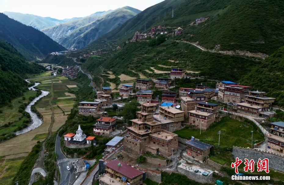 8月17日,航拍日斯?jié)M巴碉房外景。日斯?jié)M巴碉房坐落于四川省阿壩藏族羌族自治州壤塘縣宗科鄉(xiāng)加斯?jié)M村石波寨,修建于元末明初,距今已有近700年的歷史。碉房共分九層,高25.6米,外型呈階梯狀,是一座保存完好的藏式傳統(tǒng)民居。2006年,日斯?jié)M巴碉房被列為全國重點(diǎn)文物保護(hù)單位。(無人機(jī)照片) 中新社記者 王磊 攝