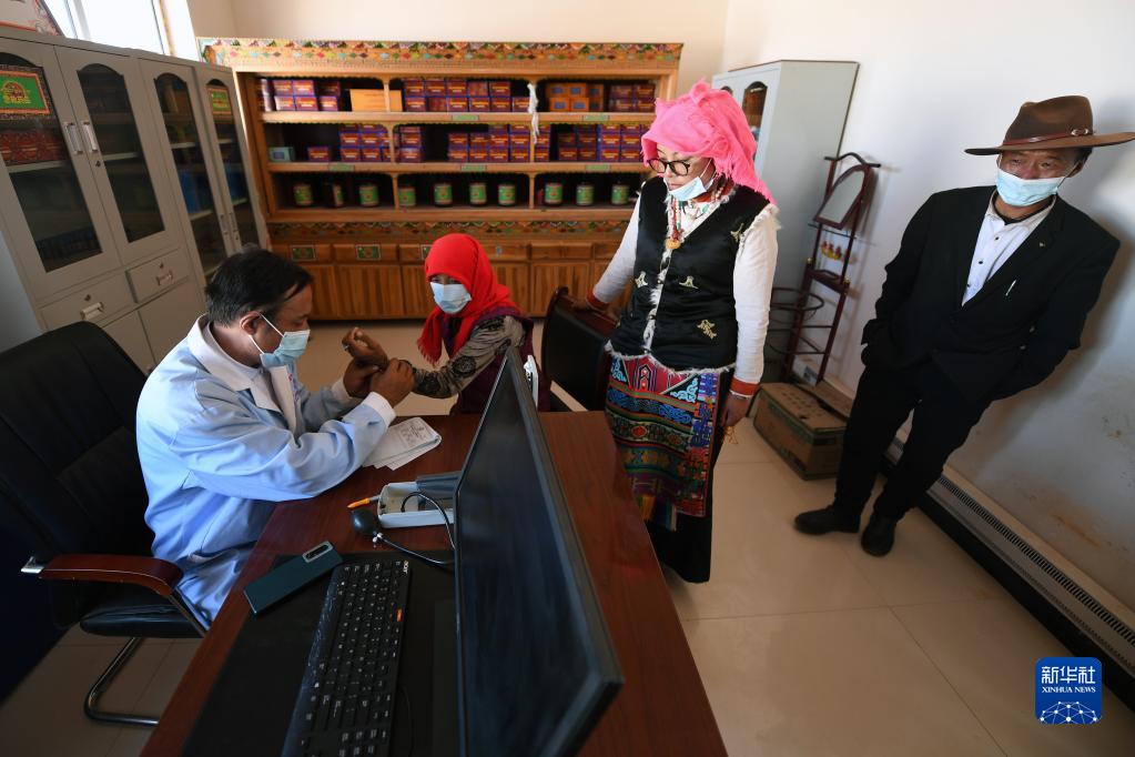 在治多縣索加鄉(xiāng)衛(wèi)生院,布久索南更青(左一)為患者診療(8月11日攝)。新華社記者 范培珅 攝