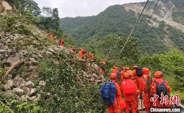 救援人員正在通過(guò)地震受損的山體路段。四川森林消防供圖