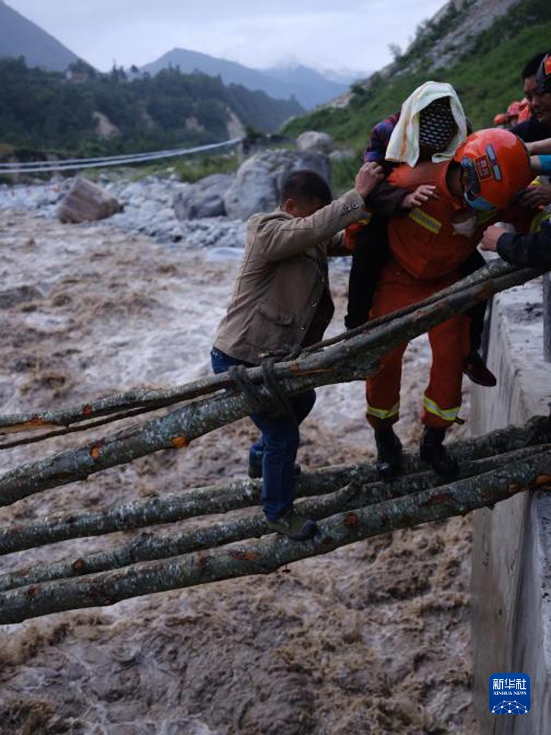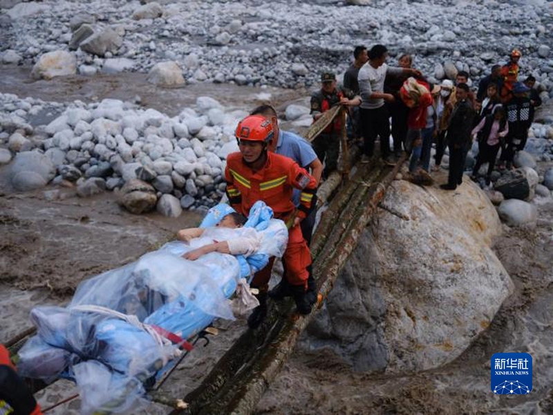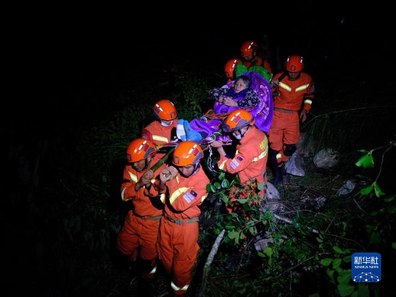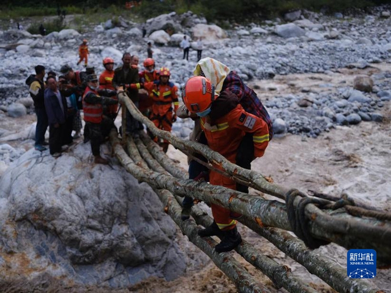9月5日,四川省森林消防總隊(duì)甘孜支隊(duì)消防員在瀘定縣磨西鎮(zhèn)青崗坪村轉(zhuǎn)移群眾和傷員。程雪力 攝