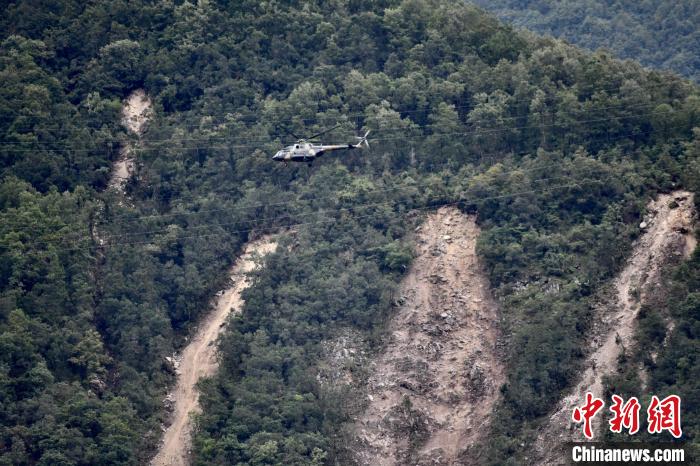救援直升機轉(zhuǎn)運傷員,山體垮塌痕跡赫然可見。張浪 攝