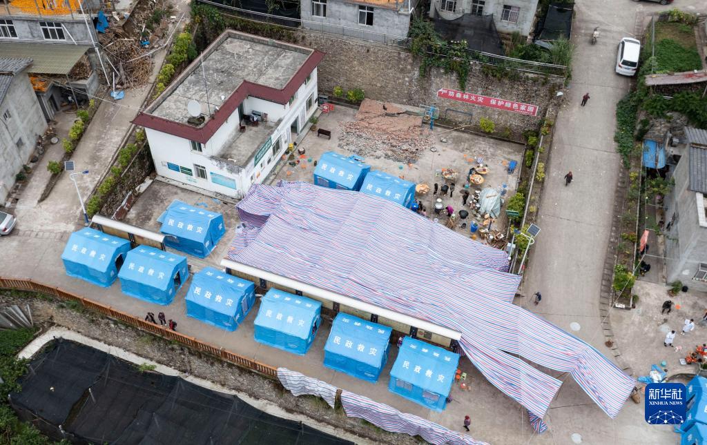 9月7日,在雅安市石棉縣王崗坪彝族藏族鄉(xiāng)幸福村村委會(huì)小廣場,村民們搭起帳篷吃住在一起(無人機(jī)照片)。新華社記者 才揚(yáng) 攝