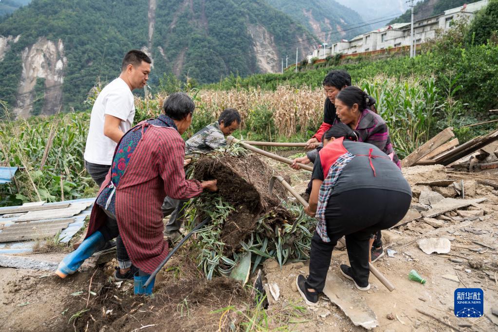 9月7日,在雅安市石棉縣王崗坪彝族藏族鄉(xiāng)幸福村二組,村民在倒塌的豬圈中搬運(yùn)苞米葉。新華社記者 才揚(yáng) 攝