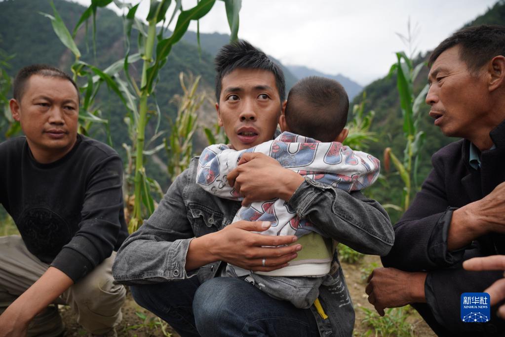 9月7日,在雅安市石棉縣王崗坪彝族藏族鄉(xiāng)幸福村二組,一名男子抱著生病的孩子準(zhǔn)備登上直升機(jī)去縣城。新華社記者 才揚(yáng) 攝