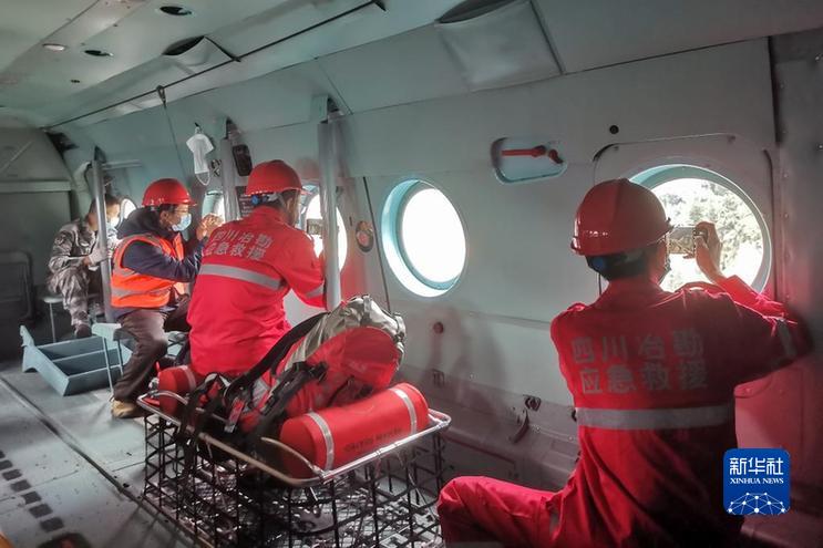 9月7日,四川省冶勘設(shè)計(jì)集團(tuán)有限公司的調(diào)查隊(duì)員在前往海螺溝景區(qū)的直升機(jī)上拍攝。新華社發(fā)(四川省冶勘設(shè)計(jì)集團(tuán)有限公司供圖)