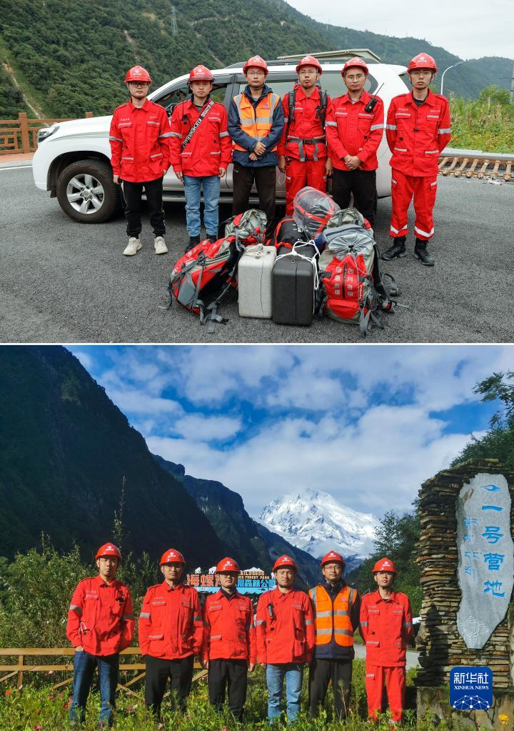 這是一張拼版照片,上圖為:9月7日,四川省冶勘設(shè)計(jì)集團(tuán)有限公司的6名調(diào)查隊(duì)員在搭乘直升機(jī)去往海螺溝前拍攝的合影(新華社記者沈伯韓攝);下圖為:9月10日,6名調(diào)查隊(duì)員在海螺溝景區(qū)一號(hào)營(yíng)地拍攝的合影(四川省冶勘設(shè)計(jì)集團(tuán)有限公司供圖)。新華社發(fā)