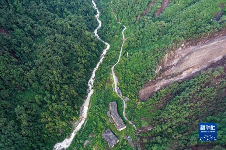 這是9月7日拍攝的海螺溝景區(qū)一號(hào)營(yíng)地下游處的崩塌災(zāi)害現(xiàn)場(chǎng)(左上部分)(無人機(jī)照片)。新華社發(fā)(四川省冶勘設(shè)計(jì)集團(tuán)有限公司供圖)