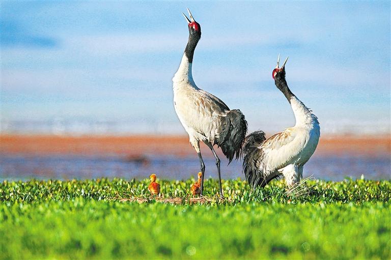 棲息在碌曲尕海濕地的國家一級保護(hù)動物黑頸鶴。新甘肅·甘肅日報通訊員 張勇