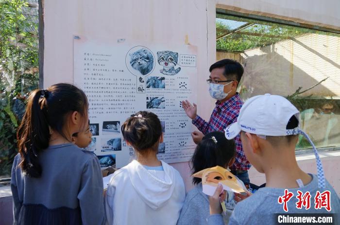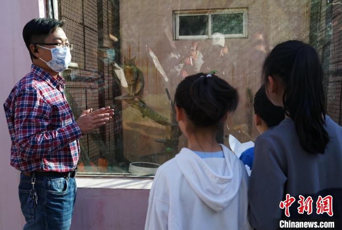 圖為青海野生動物救護(hù)繁育中心副主任向?qū)W生介紹荒漠貓。馬銘言 攝