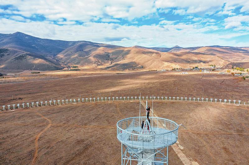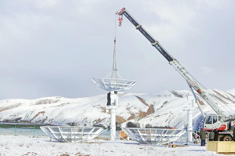 2022年11月13日 工人正在安裝圓環(huán)陣太陽射電成像望遠(yuǎn)鏡設(shè)備的最后一個(gè)天線面。