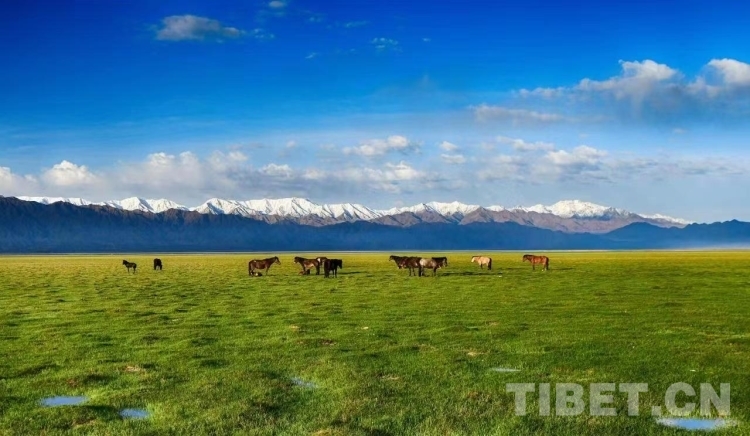 圖為藍天白云雪山掩映下的烏蘭草原