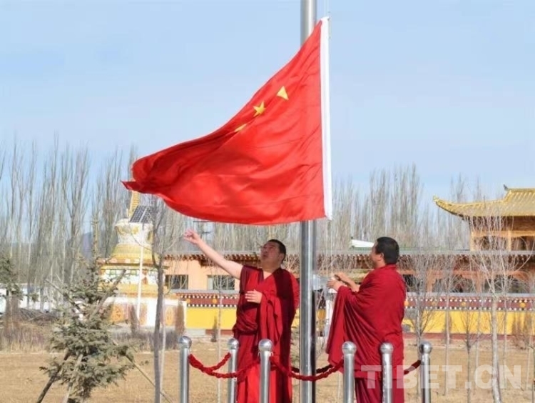 圖為青海省海南藏族自治州僧人在宗教活動(dòng)場(chǎng)所升國(guó)旗