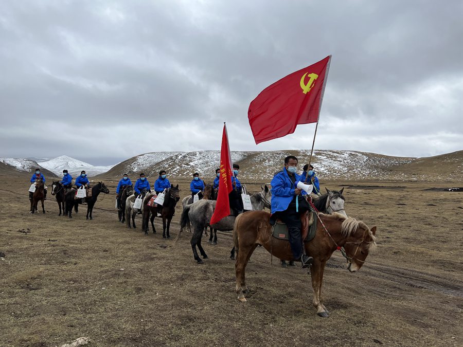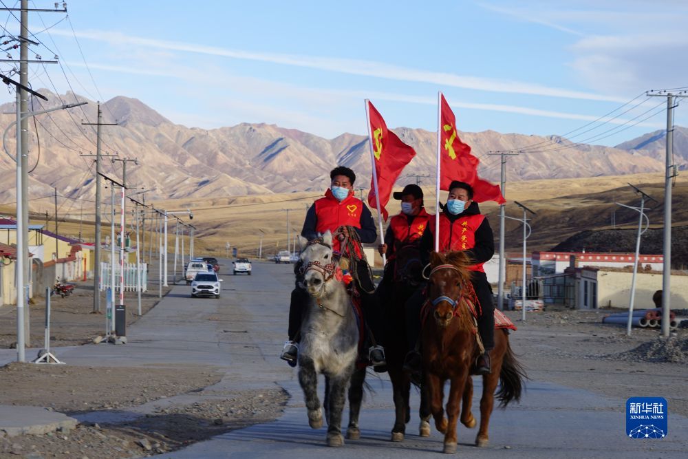 冬日,地處祁連山腳下的達玉村陽光遍灑。雖然天氣晴好,但寒風的凜冽絲毫不減。才讓扎西一手握著黨旗,一手拽緊韁繩,熟練地蹬上馬鐙、躍身上馬。