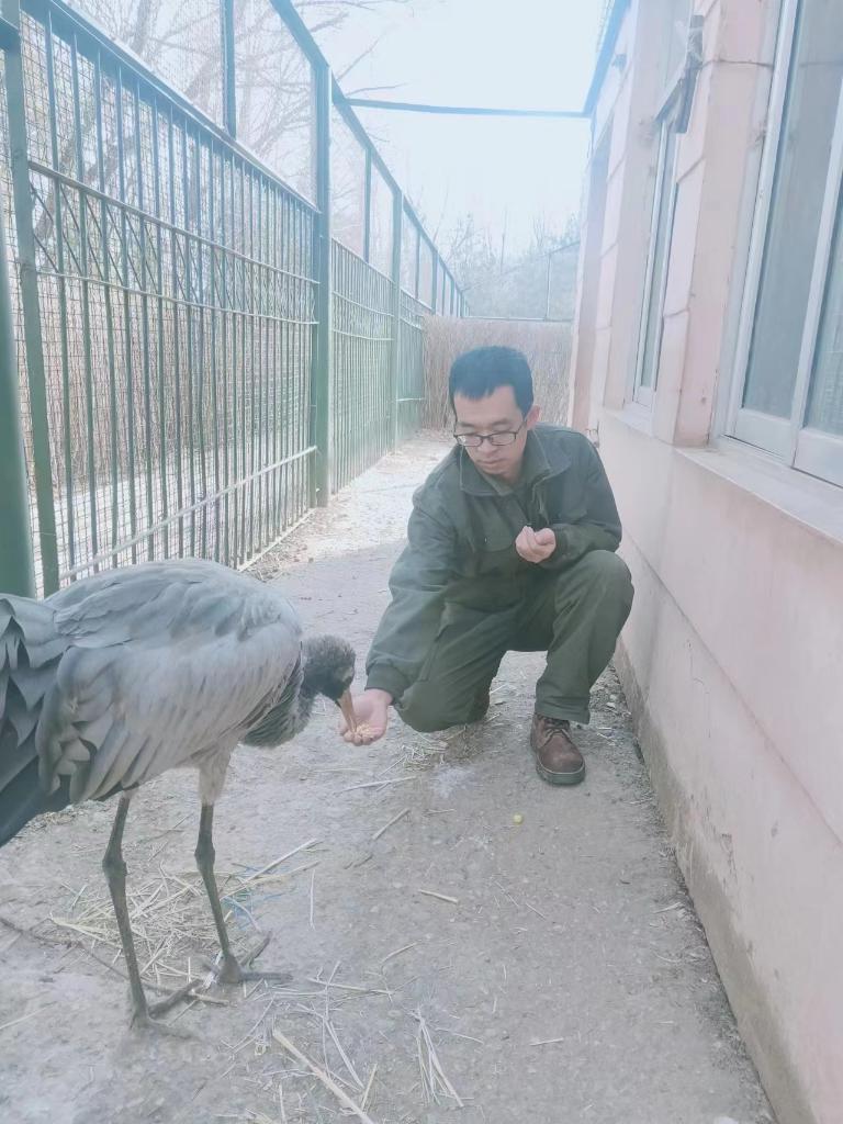 2023年2月2日,飼養(yǎng)員張小波正在喂養(yǎng)“千鶴”。(西寧野生動物園供圖)