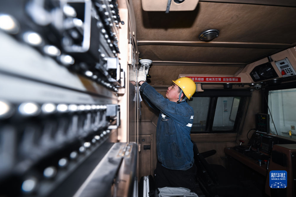 2月4日,在格爾木機(jī)務(wù)段檢修車間,馬國仁在駕駛室檢查。新華社記者 張龍 攝