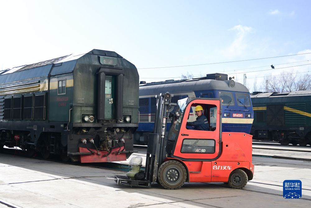 2月4日,在格爾木機(jī)務(wù)段檢修車間,馬國仁駕駛叉車搬運(yùn)部件。新華社記者 張龍 攝