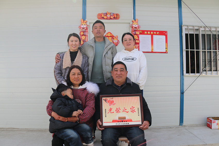 吃晚飯前,甘啟均叫上家里6口人,在板房門前拍了一張“全家?!保掌腥蚓o緊相偎,“光榮之家”的牌匾格外亮眼。