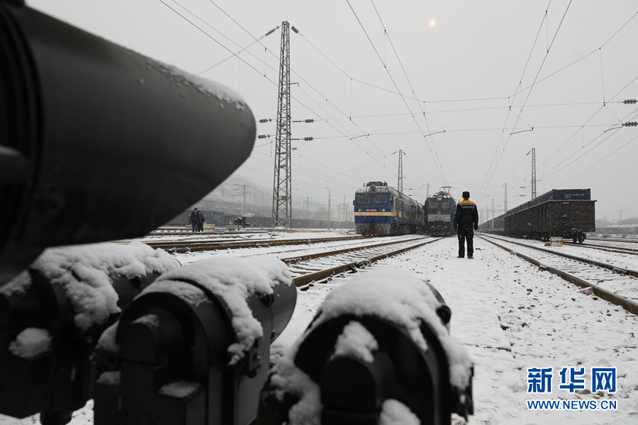 列檢人員在雪中等待列檢。新華網(wǎng) 鐵萬鋼 攝