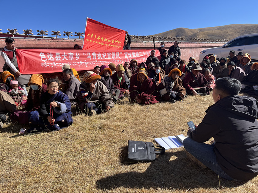 “針對(duì)色達(dá)高寒偏遠(yuǎn)、地廣人稀,牧區(qū)群眾生活居住較分散的情況,我們調(diào)配縣鄉(xiāng)村三級(jí)紀(jì)檢監(jiān)察力量,逐步組建起精通藏漢雙語、熟悉紀(jì)法知識(shí)、擅長(zhǎng)群眾工作的馬背執(zhí)紀(jì)宣講隊(duì),把黨的聲音傳遞到云端藏寨、天邊牧場(chǎng)?!鄙_(dá)縣紀(jì)委書記、監(jiān)委主任陳玉龍介紹,黨的二十大以來,宣講隊(duì)已開展宣講活動(dòng)20余場(chǎng)次,推動(dòng)為群眾辦實(shí)事10余件,解決困難訴求20件。