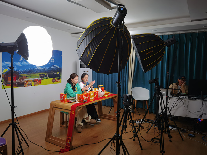 “這是吃天然草、喝雪山水的牦牛做成的多種口味肉干,可滿足不同口味的消費者;這是我們老鄉(xiāng)每天早上都要打的酥油茶,通過改良做成了便攜式袋裝,用開水沖服就可以喝上醇香的酥油茶……”3月19日,在理塘縣的“高原上”抖音直播間,主播賣力地推銷鵬飛牦牛肉干、密奇奇酥油茶等當(dāng)?shù)剞r(nóng)特產(chǎn)品。