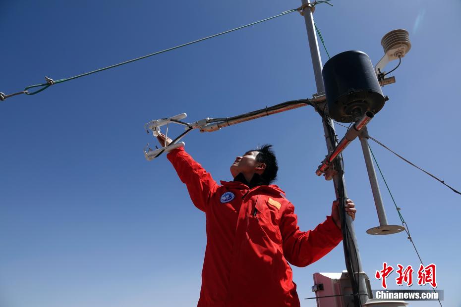第二次青藏科考隊(duì)員、中科院空天院博士生呂云哲在觀測(cè)站現(xiàn)場(chǎng)維護(hù)擦拭觀測(cè)設(shè)備探頭。中新社記者 孫自法 攝