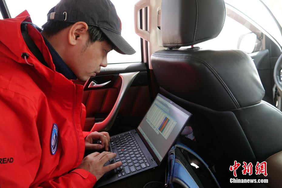 觀測(cè)站現(xiàn)場(chǎng),第二次青藏科考隊(duì)員、中科院空天院鄭超磊副研究員隨即在車上進(jìn)行數(shù)據(jù)初步檢查處理工作。中新社記者 孫自法 攝