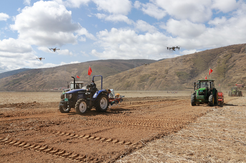 播種機、植保無人機等農業(yè)機械各司其職、協(xié)同作戰(zhàn)。
