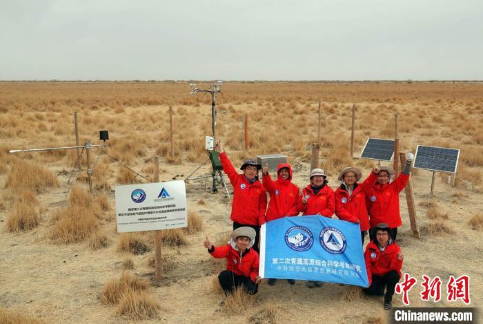 經(jīng)過不懈努力,格爾木濕地站終于建成,第二次青藏科考中科院空天院分隊在站前合影慶祝。中新社記者 孫自法 攝