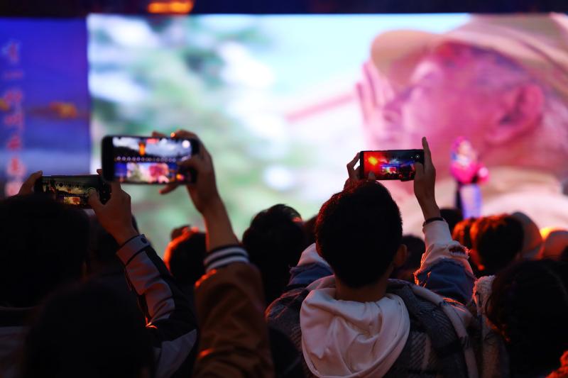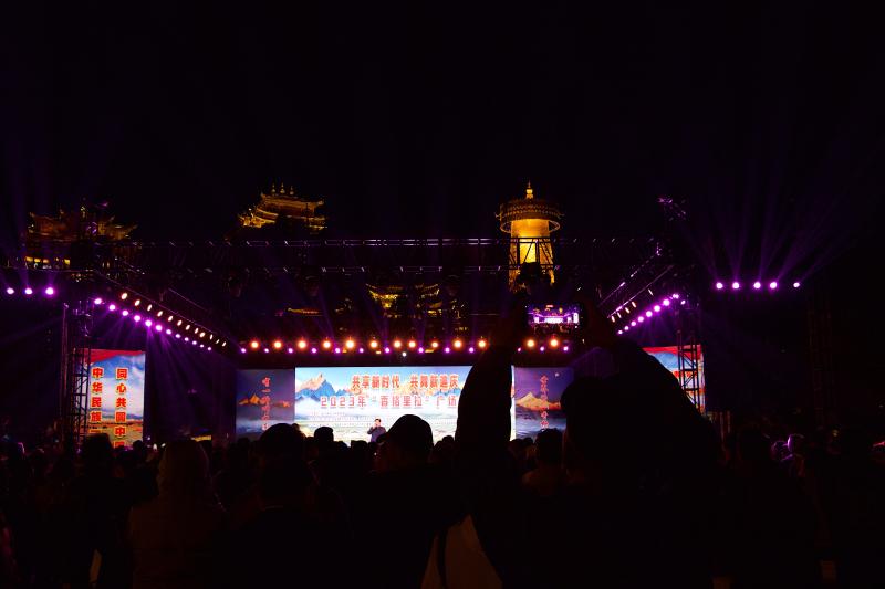 演唱會(huì)結(jié)束后,“彩云之南等你來(lái)”世界的香格里拉歡迎您——夜間群眾文藝演出活動(dòng)隨即開(kāi)始,現(xiàn)場(chǎng)燈光閃爍,游客與當(dāng)?shù)厝罕娨黄?,圍著廣場(chǎng)中央的篝火載歌載舞,盡情體驗(yàn)縱情舞蹈的歡樂(lè)。