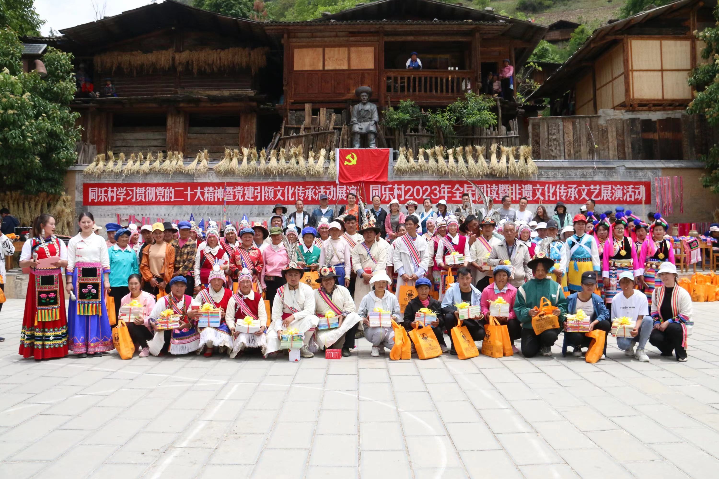 活動(dòng)現(xiàn)場(chǎng)熱鬧非凡,同樂(lè)村文化活動(dòng)廣場(chǎng)主席臺(tái)前整齊地陳列著捐贈(zèng)的圖書(shū)、展示的“花臘裱”等非遺產(chǎn)品,上百名群眾身著民族盛裝參與全民閱讀宣傳活動(dòng)和非遺展演展示活動(dòng)?;顒?dòng)中,州圖書(shū)館向同樂(lè)村捐贈(zèng)了價(jià)值13000多元的圖書(shū),并號(hào)召大家要養(yǎng)成愛(ài)讀書(shū)、讀好書(shū)、善讀書(shū)的習(xí)慣,從當(dāng)?shù)氐姆俏镔|(zhì)文化遺產(chǎn)中汲取傳統(tǒng)精粹,在讀書(shū)學(xué)習(xí)中汲取精神營(yíng)養(yǎng),努力促進(jìn)鄉(xiāng)村文化振興。