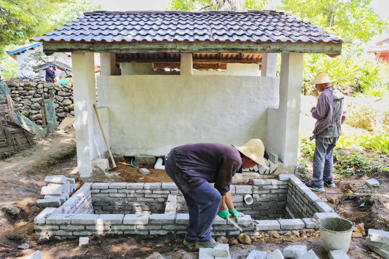 工人正在金江鎮(zhèn)吾竹村進行農(nóng)村三格式戶廁建設(shè)