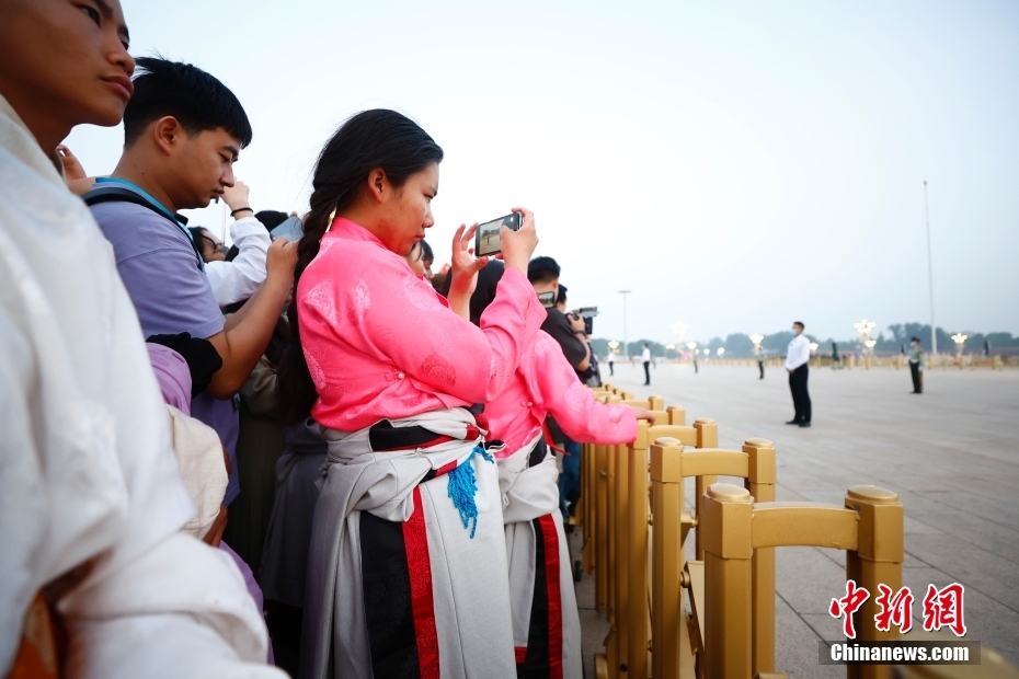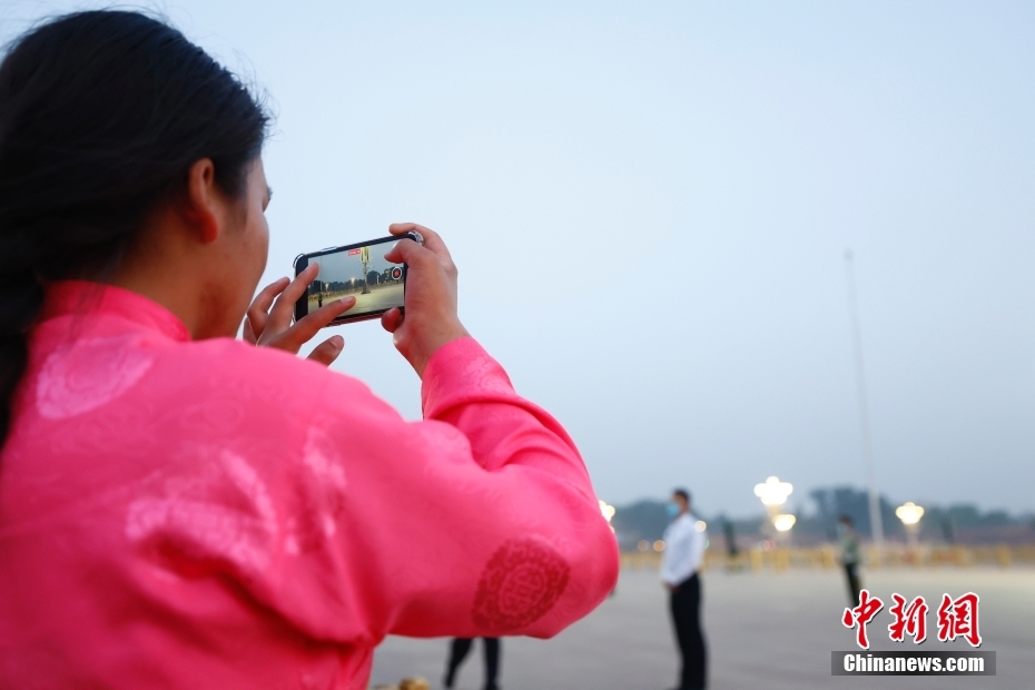 圖為青少年在天安門(mén)廣場(chǎng)看升旗。中新社記者 富田 攝