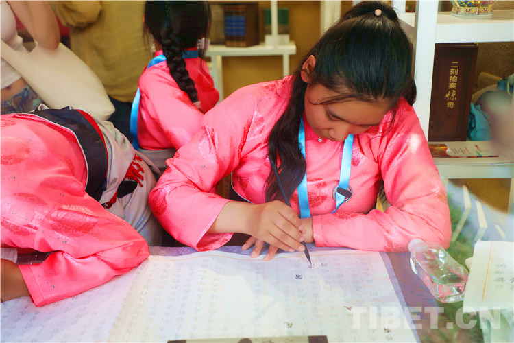 當(dāng)穿著藏裝的姑娘走過(guò)書(shū)架,翻開(kāi)四大名著,努力讀出上面的文字,在古香古色的書(shū)桌前,幾個(gè)姑娘爭(zhēng)先用毛筆描繪著宣紙上的小楷,那畫(huà)面美得像一幅幅仕女畫(huà)。