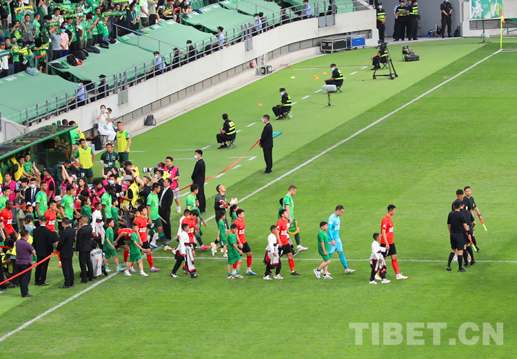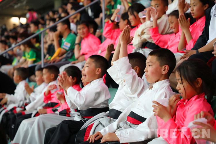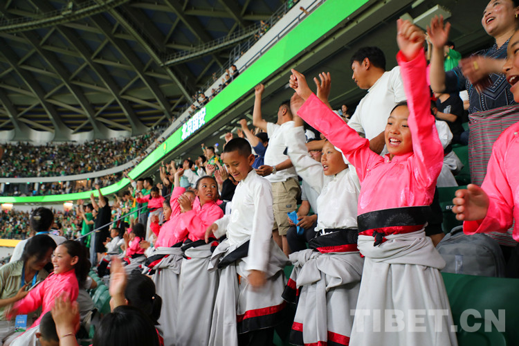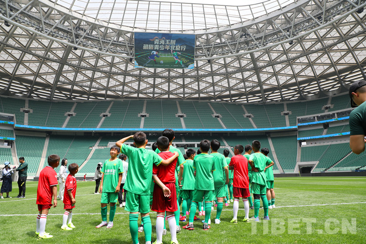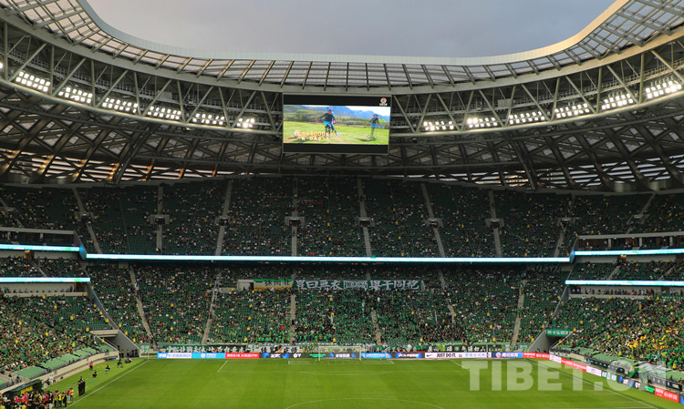 阿斌與5名小伙伴身著藏裝,牽手球員出現(xiàn)在賽場(chǎng)上,頓時(shí)吸引了全場(chǎng)目光。大屏還播放著三江源·北京情·中國(guó)心——青海玉樹藏族青少年北京行”的視頻,展示著雪域足球少年的風(fēng)采,環(huán)形LED屏幕用中文、藏文雙語滾動(dòng)播放著40位玉樹少年的名字。