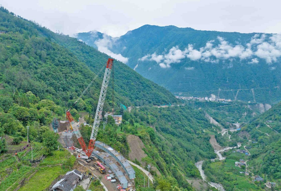 項目現(xiàn)場相關負責人介紹,海螺溝景區(qū)道路災后恢復重建工程地處鮮水河斷裂帶,道路狹窄曲折,作業(yè)面極其有限,受去年瀘定地震影響,山體巖性愈加破碎,土質更加疏松,施工難度極大,安全風險極高。為滿足原材料軋制能力及運輸界限要求,在鋼箱梁制作時,按照設計要求,將嘎木構大橋鋼箱梁累計劃分為14個節(jié)段進行制造,運輸至現(xiàn)場后拼裝成兩個主梁大節(jié)段,采用650噸履帶吊分幅開展吊裝作業(yè),其中內弧長57.708米,重約140噸,外弧長61.753米,重約145噸。