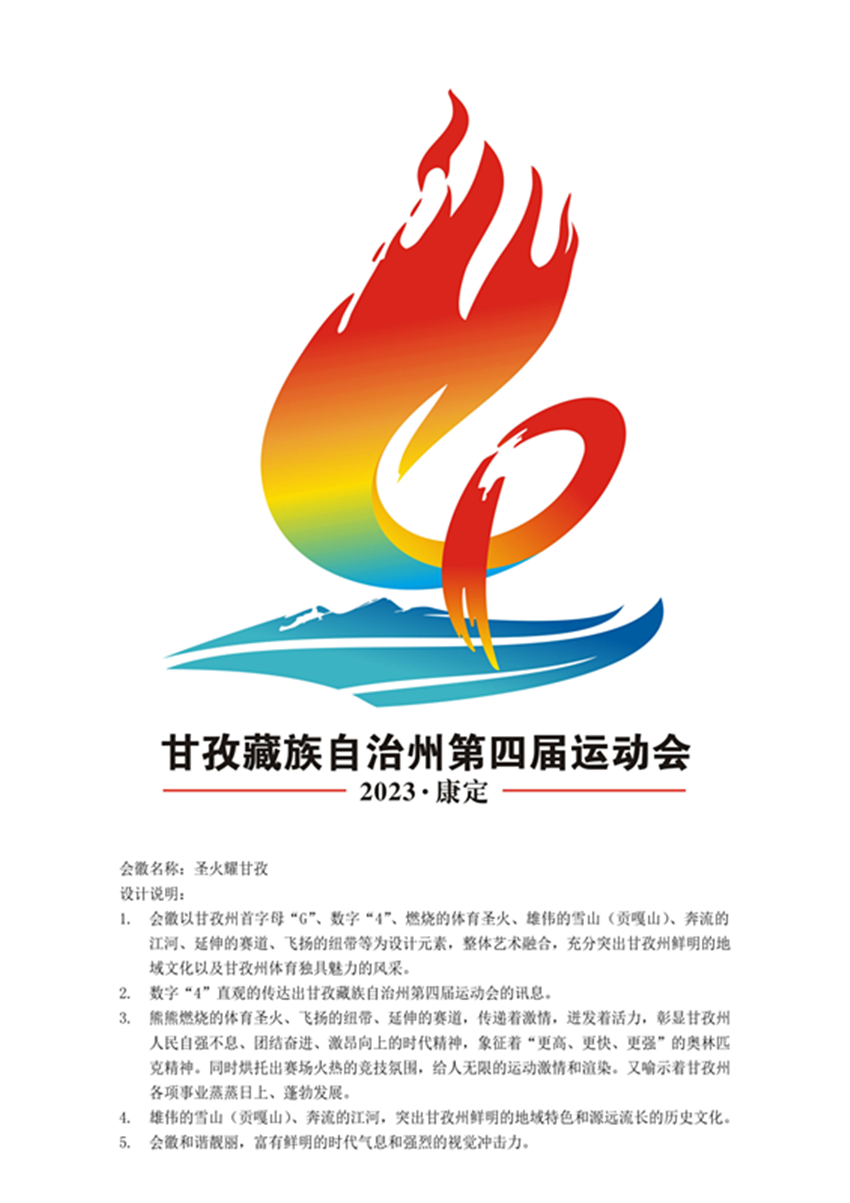 據(jù)王拓進(jìn)介紹,會(huì)徽設(shè)計(jì)靈感來(lái)自網(wǎng)上看到的貢嘎雪山,所以作品以甘孜州首字母“G”、數(shù)字“4”、燃燒的體育圣火、雄偉的雪山(貢嘎山)、奔流的江河、延伸的賽道、飛揚(yáng)的紐帶等為設(shè)計(jì)元素。數(shù)字“4”直觀(guān)地傳達(dá)出甘孜州第四屆運(yùn)動(dòng)會(huì)的訊息;雄偉的雪山(貢嘎山)、奔流的江河,突出甘孜州鮮明的地域特色和源遠(yuǎn)流長(zhǎng)的歷史文化;熊熊燃燒的體育圣火、飛揚(yáng)的紐帶、延伸的賽道,傳遞著激情、迸發(fā)著活力,彰顯甘孜州人民自強(qiáng)不息、團(tuán)結(jié)奮進(jìn)、激昂向上的時(shí)代精神,象征著“更高、更快、更強(qiáng)”的奧林匹克精神,同時(shí)烘托出賽場(chǎng)火熱的競(jìng)技氛圍,給人無(wú)限的運(yùn)動(dòng)激情和渲染,又喻示著甘孜州各項(xiàng)事業(yè)蒸蒸日上、蓬勃發(fā)展。