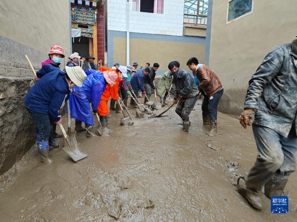 7月11日,在甘肅省甘南藏族自治州夏河縣麻當(dāng)鎮(zhèn),當(dāng)?shù)亟M織力量進(jìn)行清淤。新華社發(fā)(甘南州委宣傳部供圖)