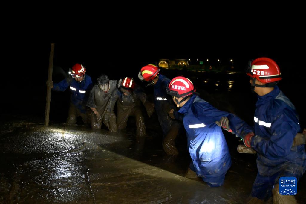 7月11日凌晨,當(dāng)?shù)鼐仍α吭陂_展人員搜救工作。新華社發(fā)(夏河縣消防救援大隊(duì)供圖)