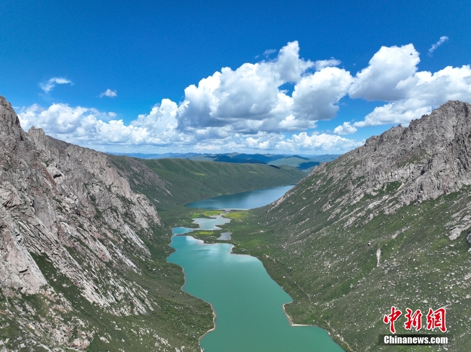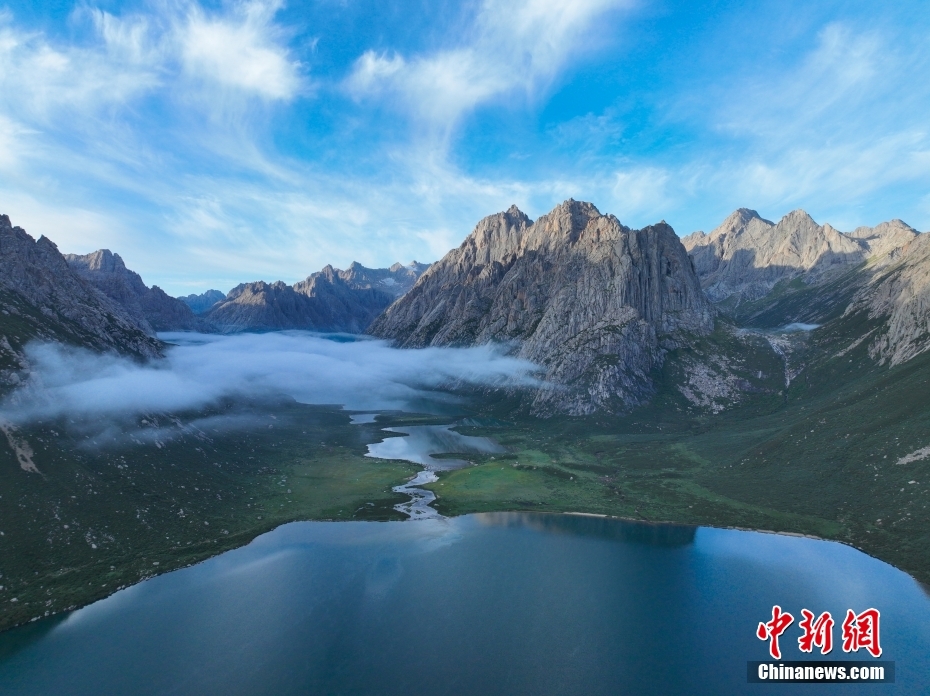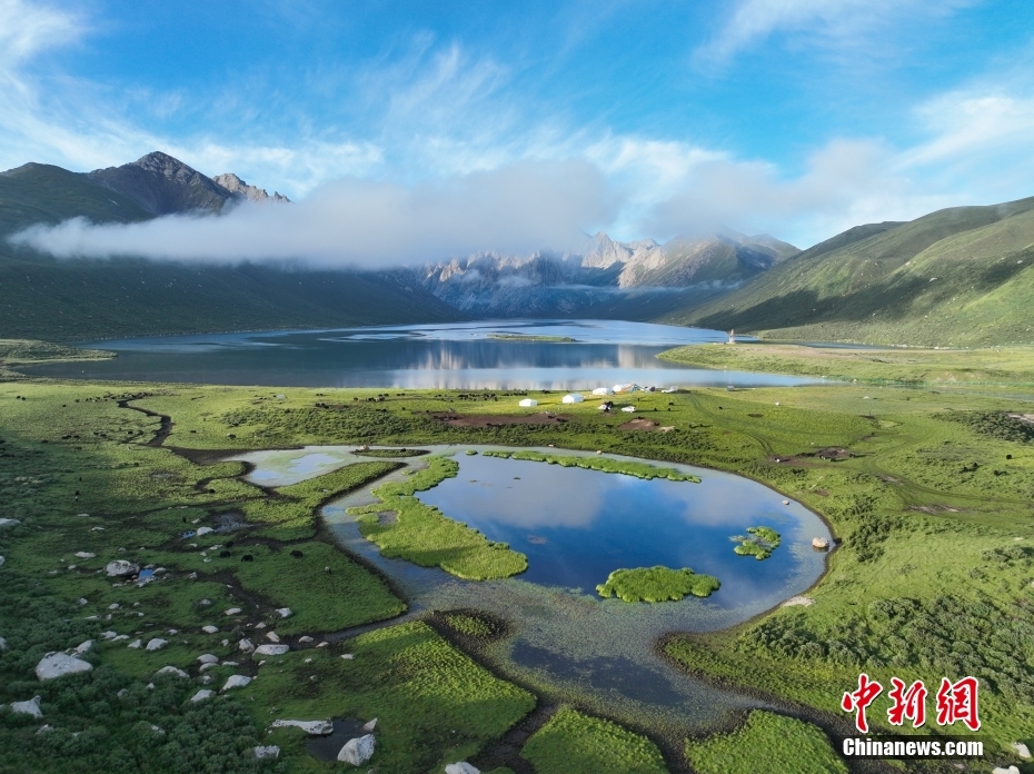 7月19日,盛夏時節(jié),青海省果洛藏族自治州久治縣年保玉則山間云霧繚繞,山下鮮花盛開,水清草豐,靜謐的湖水與嶙峋的山巒相映成趣,宛如仙境。年保玉則總面積3469平方公里,山形如蓮花,保存有冰蝕地貌、冰磧地貌、現(xiàn)代冰川等地質遺跡。(無人機照片)中新社記者 馬銘言 攝