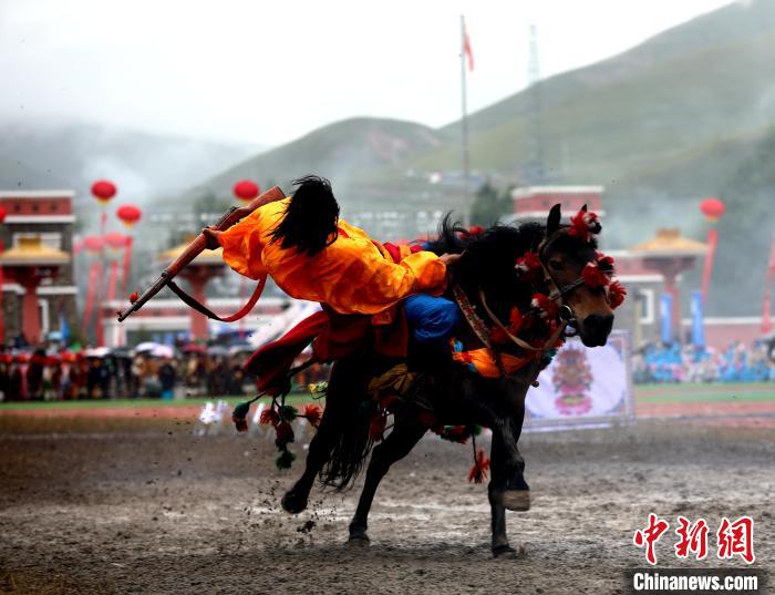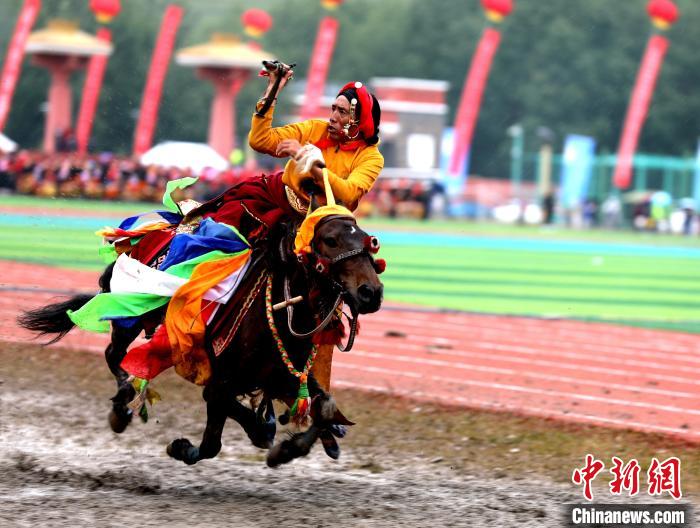 圖為玉樹傳統(tǒng)賽馬會(huì)現(xiàn)場(chǎng)的馬術(shù)表演。薛蒂 攝