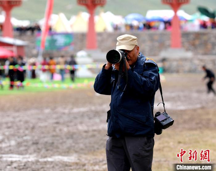 圖為西藏?cái)z影師阿旺洛桑在玉樹傳統(tǒng)賽馬會(huì)現(xiàn)場(chǎng)拍攝。薛蒂 攝