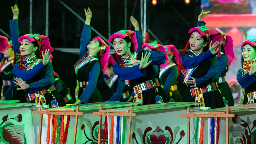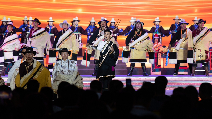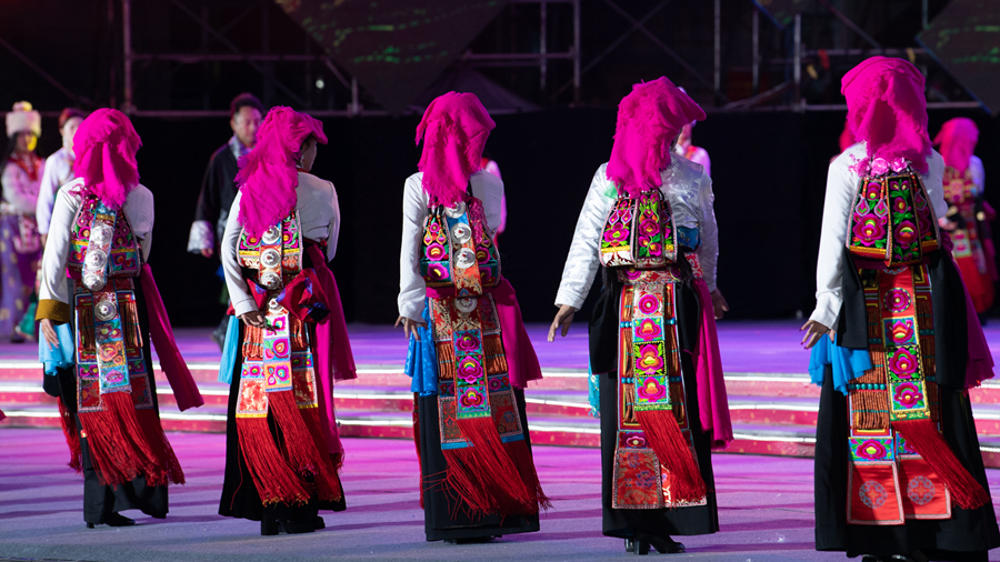 7月31日,慶祝青海省海南藏族自治州成立70周年藏族服飾藝術(shù)嘉年華迎賓晚會現(xiàn)場。