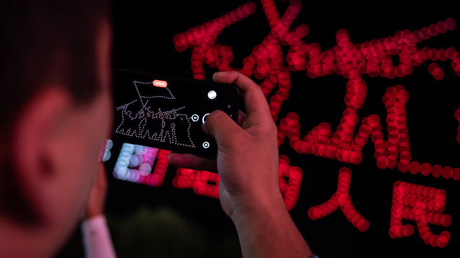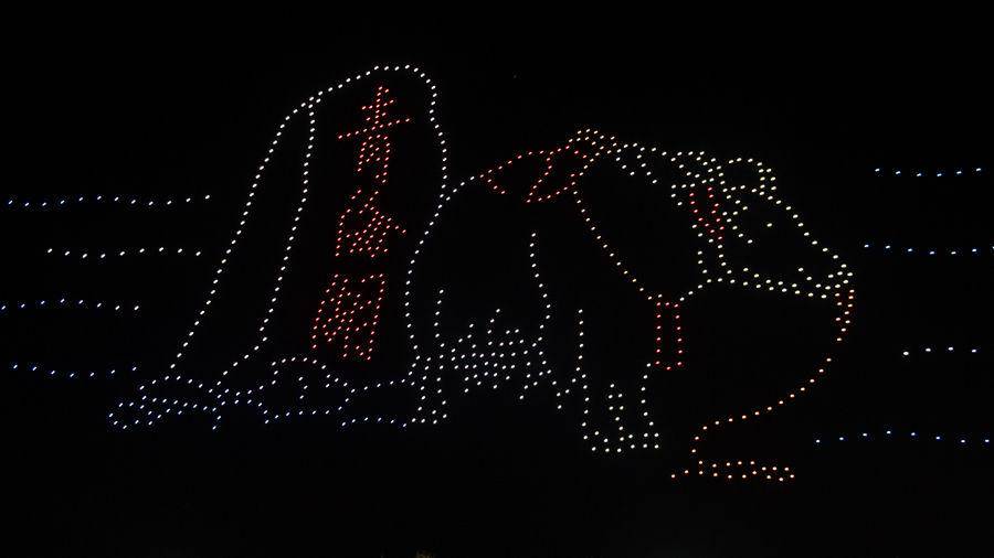 7月31日,慶祝青海省海南藏族自治州成立70周年藏族服飾藝術(shù)嘉年華迎賓晚會現(xiàn)場的無人機(jī)編隊(duì)表演。