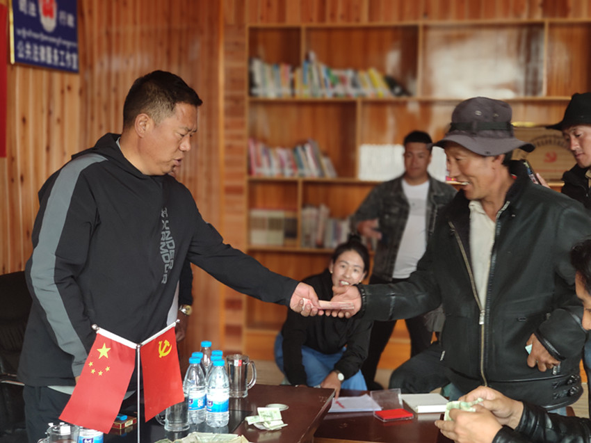 “振業(yè)振興新征程 旺達(dá)村分紅大會”的橫幅在村活動中心會議室內(nèi)鮮艷顯眼,村民們興高采烈,早早地等候在這里領(lǐng)取分紅金?!敖衲炅鬓D(zhuǎn)費(fèi)總計130000元,每戶可分紅5200元?!狈旨t儀式上,上木拉黨委書記格絨次乃向村民們介紹了旺達(dá)村房屋流轉(zhuǎn)、荒地收益情況和民宿產(chǎn)業(yè)下一步規(guī)劃。在場村民臉上無不洋溢著幸福的笑容,高興地鼓起了掌。