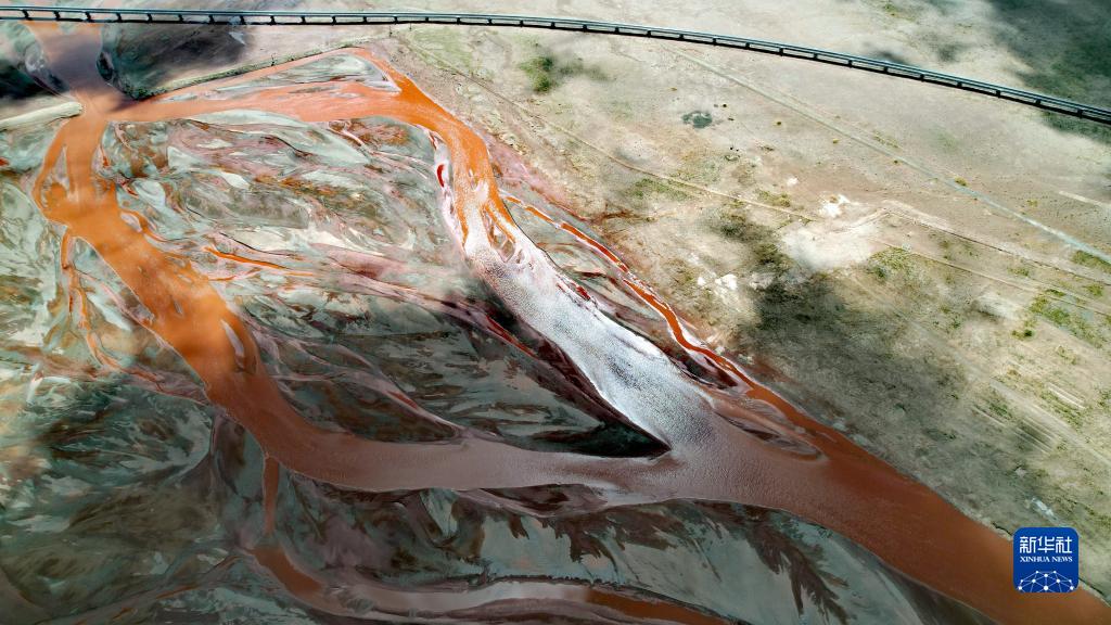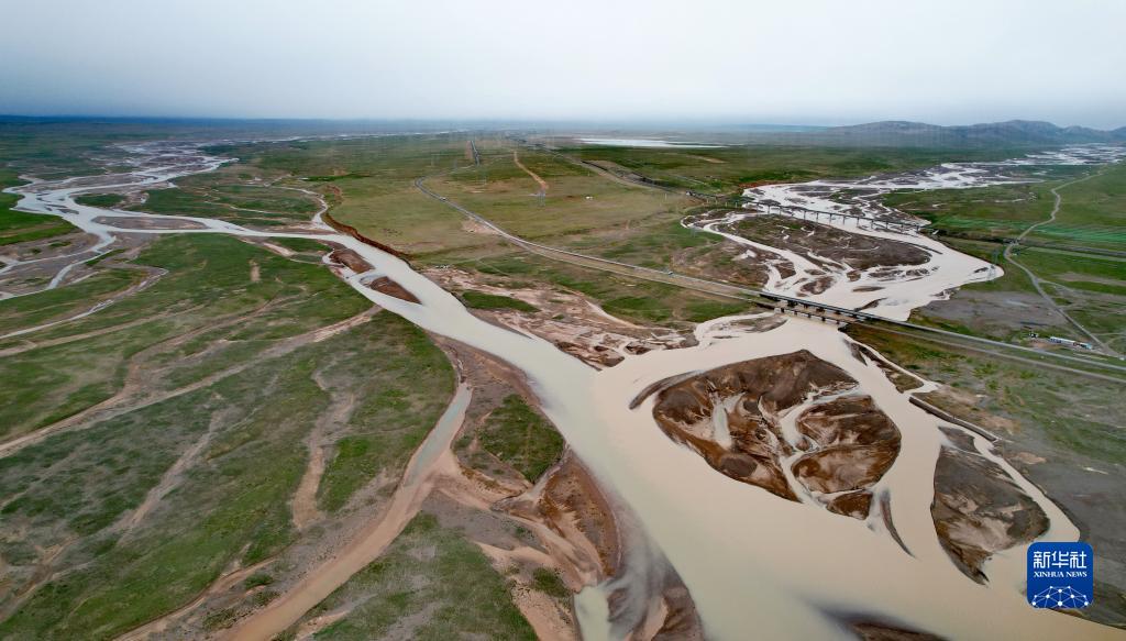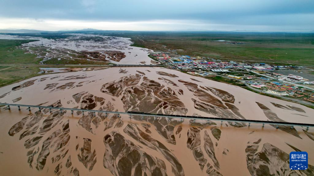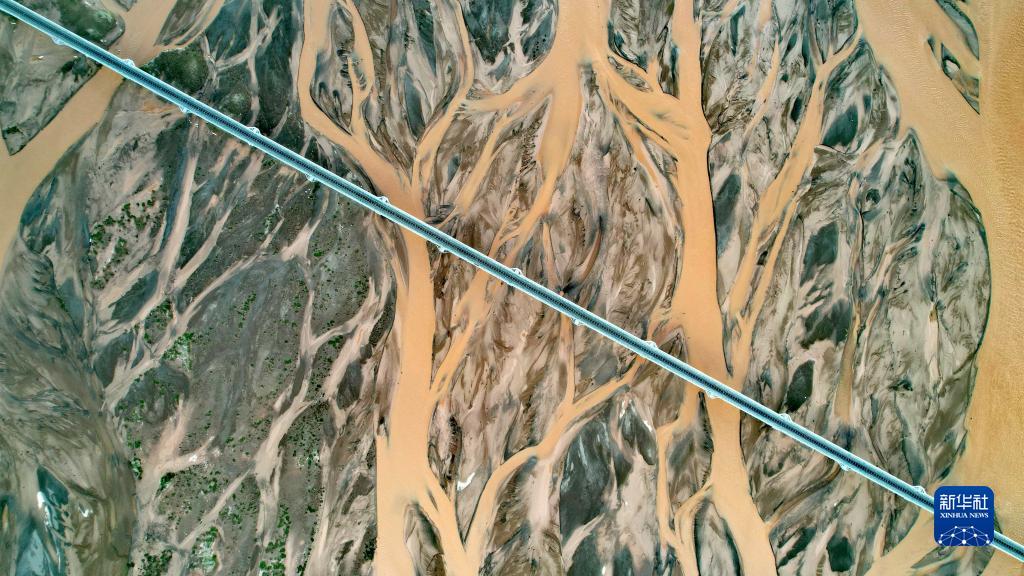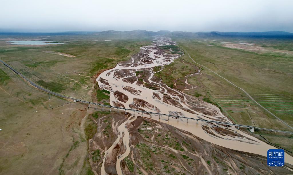青藏鐵路跨過(guò)尕爾曲的辮狀河道(7月27日攝,無(wú)人機(jī)照片)。新華社記者 劉詩(shī)平 攝