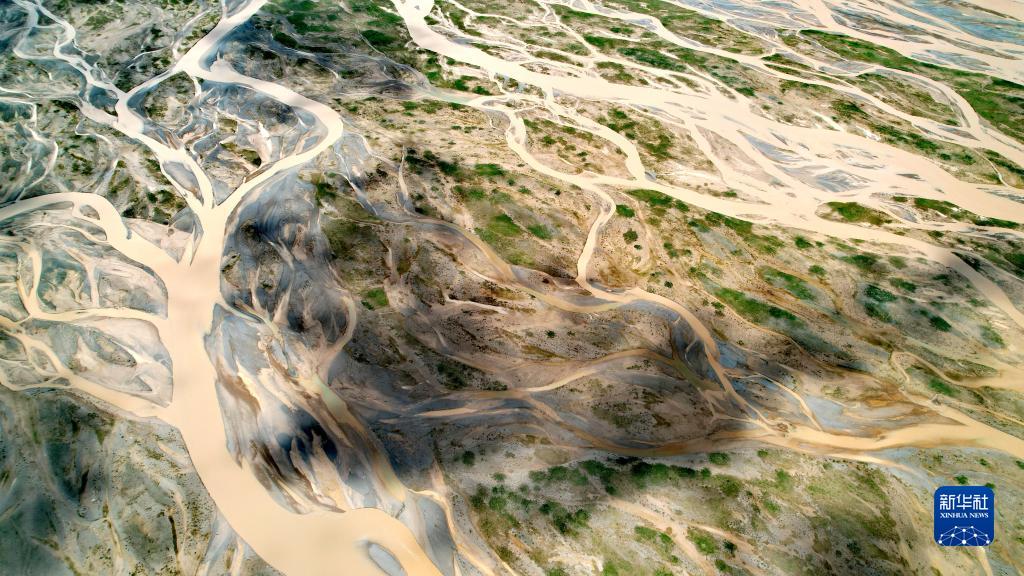 在沱沱河與當(dāng)曲匯合處的囊極巴隴拍攝的辮狀河道(7月27日攝,無(wú)人機(jī)照片)。新華社記者 劉詩(shī)平 攝