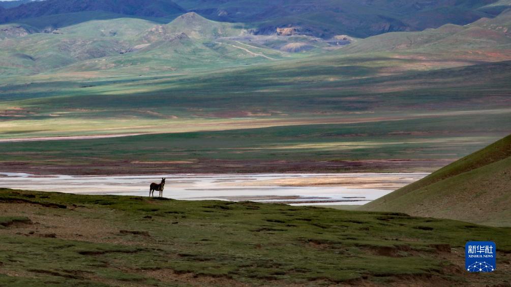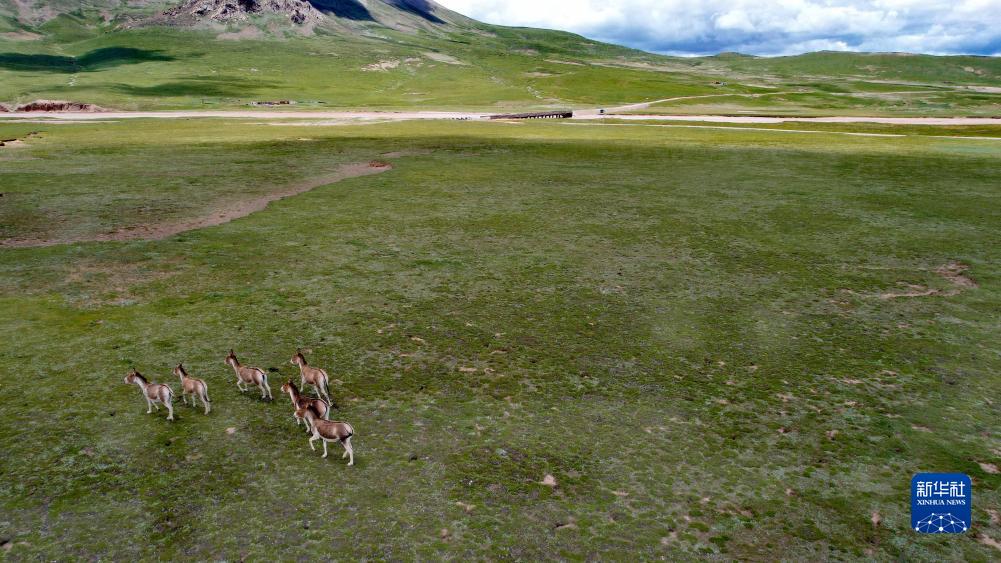 通天河支流辮狀河道旁的藏野驢(7月26日攝,無(wú)人機(jī)照片)。新華社記者 劉詩(shī)平 攝