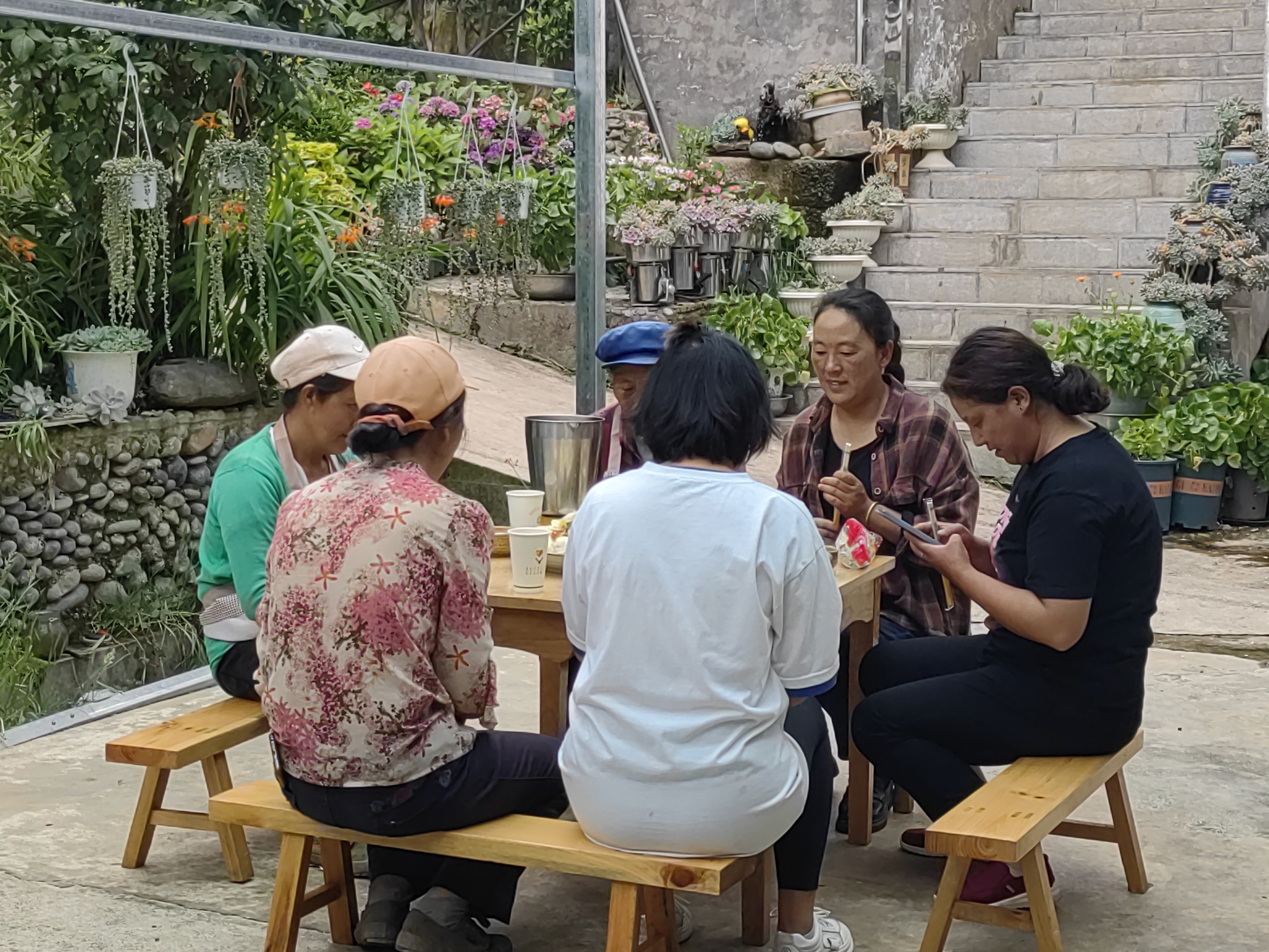 村口,一個(gè)名叫“成姐農(nóng)家樂”的小院里歡聲笑語(yǔ),熱鬧非凡。“這是今天剛挖的洋芋和新鮮采摘的瓜,待會(huì)就給客人做一道當(dāng)?shù)氐奶厣恕瞎涎笥??!薄盁豕瞎涎笥蟮臅r(shí)候,再做個(gè)鍋邊粑粑,這樣的農(nóng)家味道客人肯定喜歡?!痹谵r(nóng)家樂里忙碌的姐妹們邊洗菜邊討論著當(dāng)天的菜品。