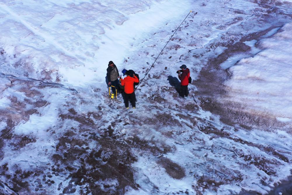 “這是我們第二次登上格拉丹東雪山主峰冰川,在去年測量的區(qū)域開展了4條測量線的雷達探測。”董士琦說,去年測量區(qū)域冰川平均厚度約12米,此次探測結果可用來比較冰川的厚薄變化,為計算冰儲量積累數(shù)據(jù)。